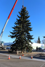 Town of Stettler employees and a Heartland Industries crane operator cut the massive spruce and lowered it gently into a Town of Stettler dump truck. The tree was then transported to Main Street, where the same crane lifted it and lowered it into its location in a Main Street maintenance hole. The tree was shimmed in place, the ‘no left turn’ signs were put up, and the decorating began for the moment we all love on the night of the Moonlight Madness.